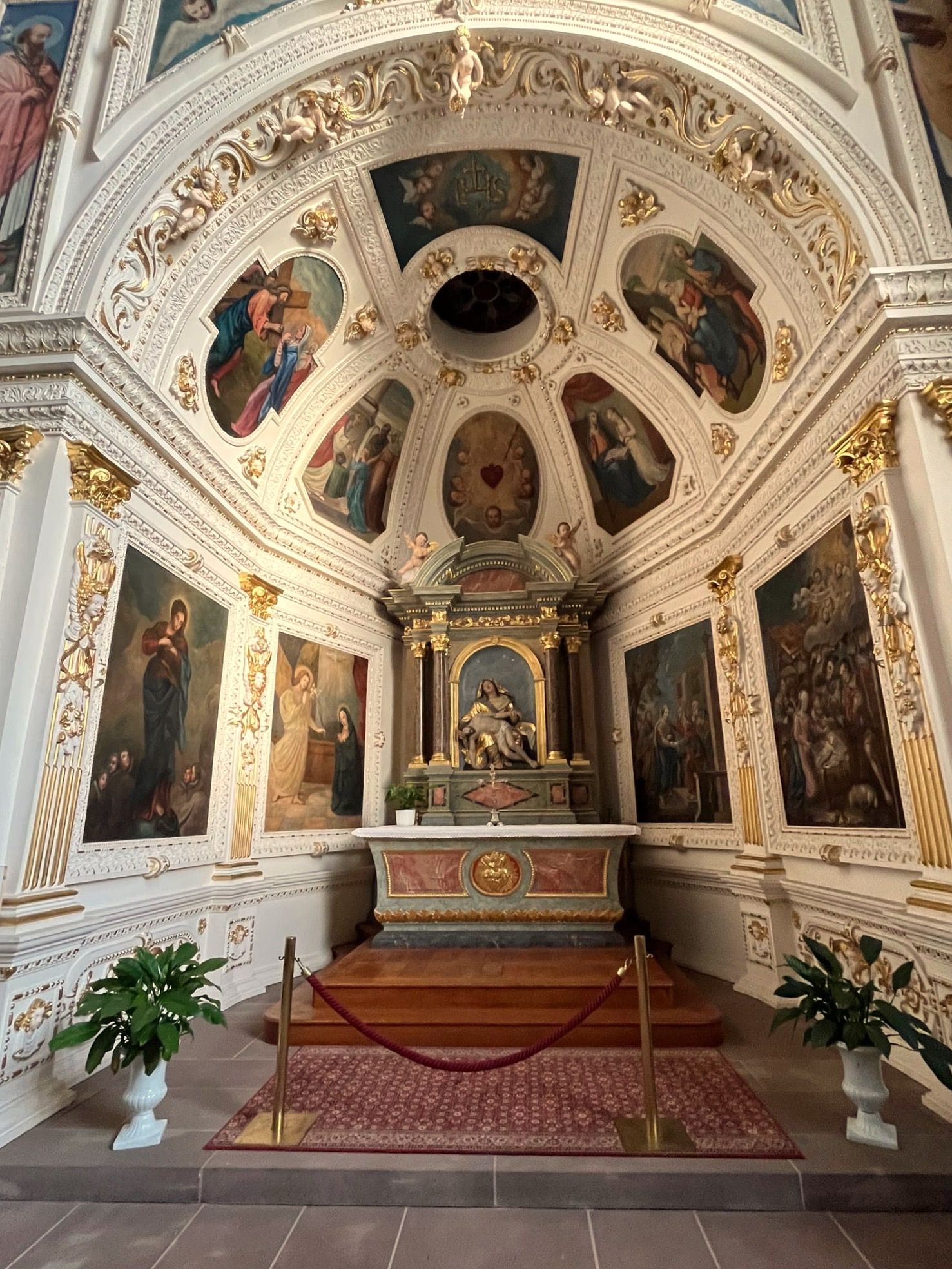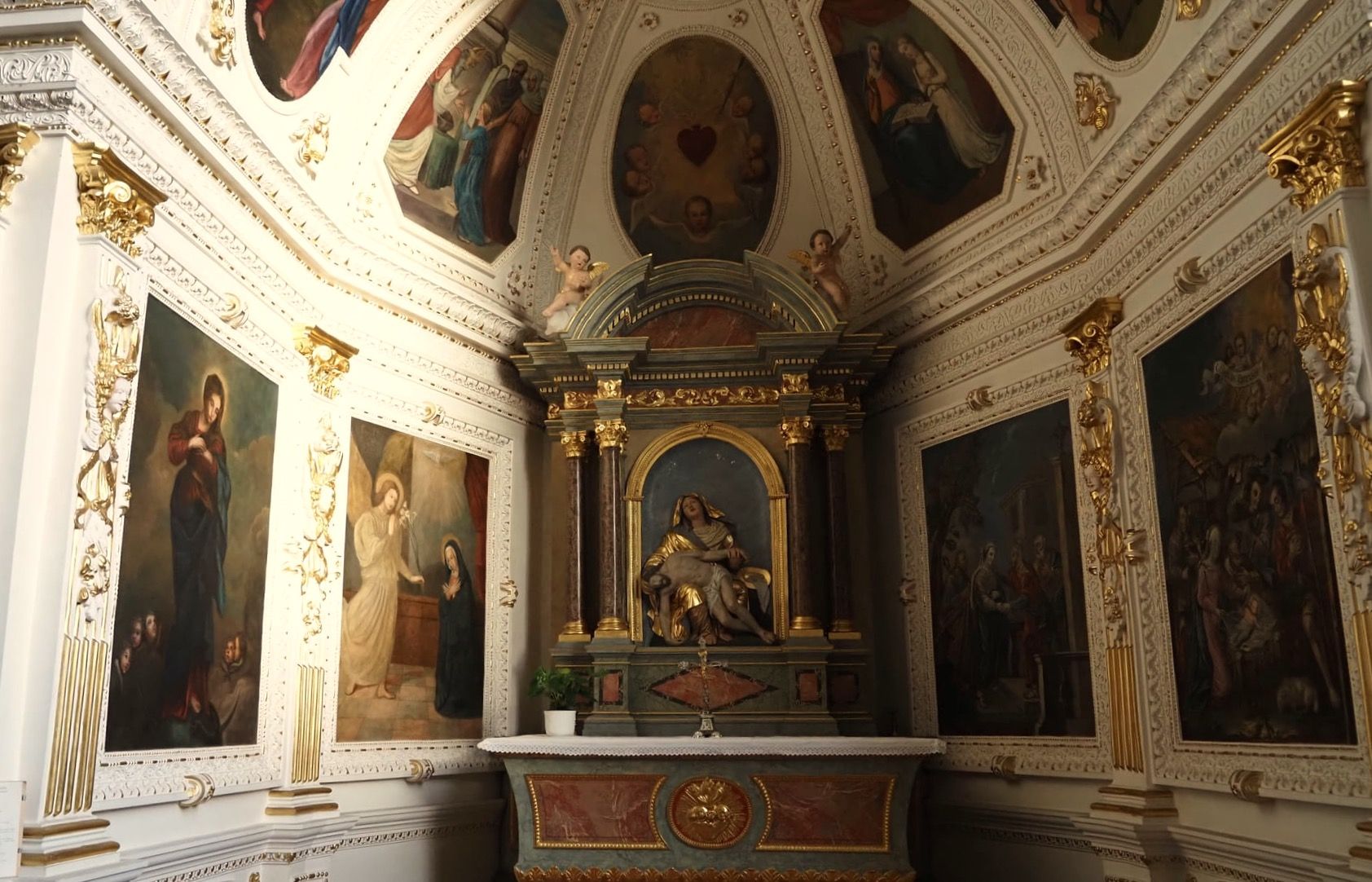 Aujourd'hui, la nef, épurée en 1970 lors d'une restauration, contraste avec les décors des stucs et peintures des deux chapelles des transepts.